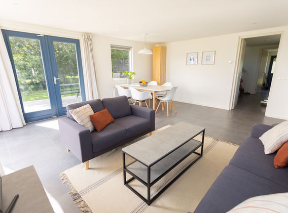 De woonkamer is voorzien van een twee- en driezitsbank, grote eettafel, 'smart' televisie, dvd-speler en radio. Toegang tot het terras met openslaande deuren.