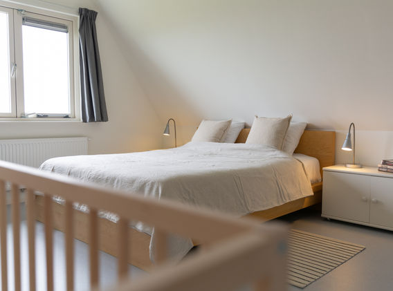 Een tweepersoons bed van 140 x 200, toegang tot de badkamer. De badkamer is voorzien van toilet, wasmeubel, inloopdouche, designradiator en föhn.